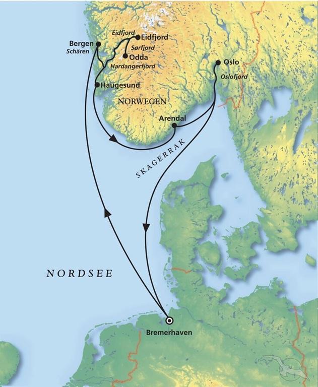 Routenverlauf: Bremerhaven – Einschiffung, Urlaub auf See, Vik / Norwegen, Kreuzen im Schären, Bergen / Norwegen, Odda / Norwegen, Kreuzen im Sør-& Eidfjord, Eidfjord / Norwegen, Haugesund / Norwegen, Arendal / Norwegen, Kreuzen im Oslofjord, Oslo / Norwegen, Erholung auf See, Bremerhaven