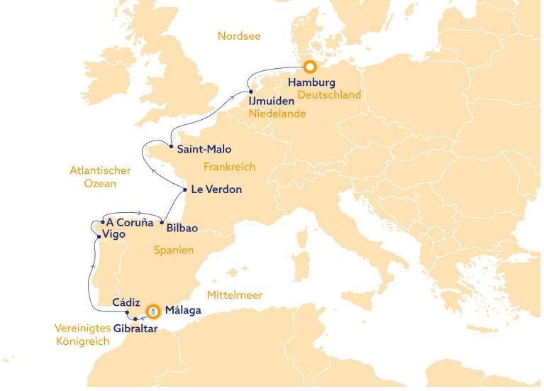 Ihre Route führt Sie in 16 Tagen von Málaga • Gibraltar • Cádiz • Vigo • A Coruña • Bilbao • Port Médoc • Saint-Malo • Amsterdam • Hamburg